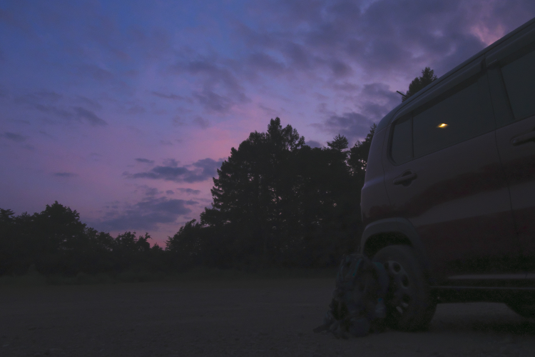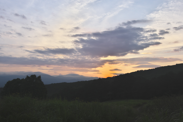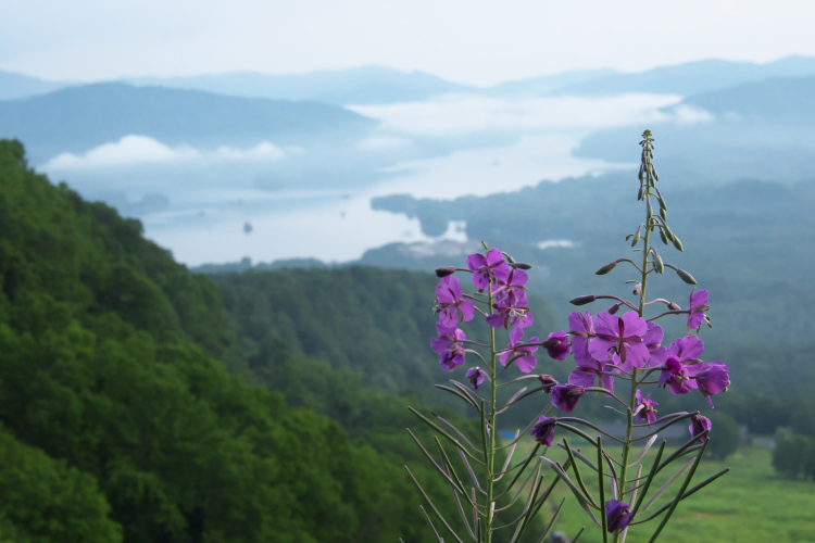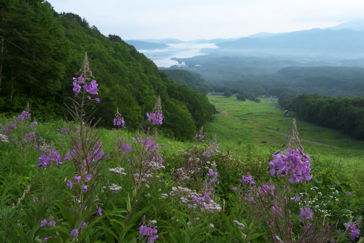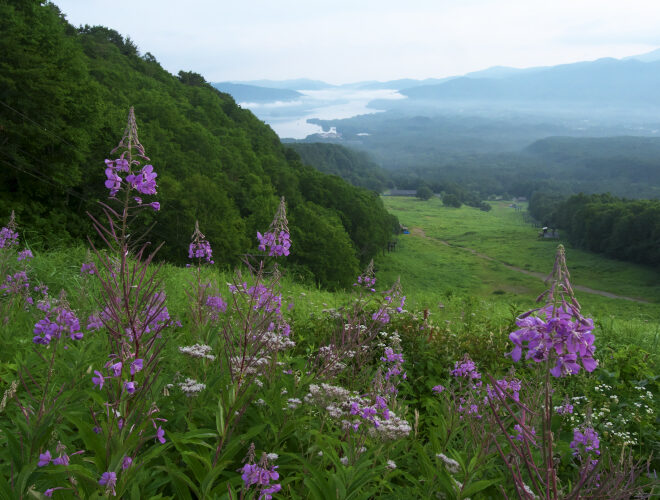 朝、日の出前の4時30分に登山開始。朝焼けを横目に見ながら裏磐梯スキー場を登り始め、40分くらいで第2ロマンスリフト降り場到着。ここにヤナギランが群生していました。