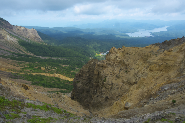 急登部分の中盤は両側に鉄のU字手すりがついているので助かります。手すりが無くなってしばらく林の中を登ると急に視界が広がり、背後に雄大な裏磐梯の風景が広がりました。